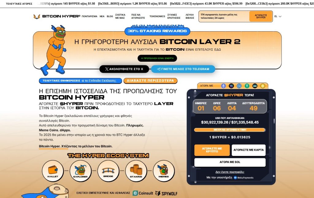 Το Bitcoin Hyper ($HYPER) συνεισφέρει θετικά στην αγορά, παρέχοντας ένα Layer-2 δίκτυο πάνω στο Bitcoin με δυνατότητα smart contracts, staking και γρήγορες, χαμηλού κόστους συναλλαγές.