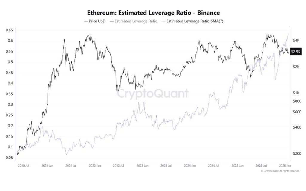 Σύμφωνα με πρόσφατα δεδομένα από την CryptoQuant, ο δείκτης Estimated Leverage Ratio του Ethereum στο Binance παραμένει σε ιστορικά υψηλά επίπεδα, με τον 7ήμερο κινητό μέσο όρο κοντά στο 0,632. Με απλά λόγια, η αγορά είναι έντονα φορτωμένη με μοχλευμένες θέσεις.