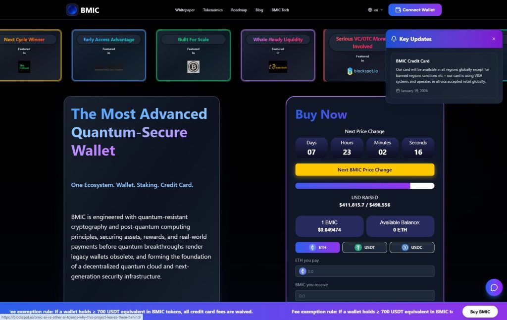 Το BMIC είναι ένα έργο στο Web3 που εστιάζει στην ασφάλεια και την ανθεκτικότητα του ψηφιακού χρήματος, προσφέροντας πορτοφόλι ανθεκτικό σε κβαντικές επιθέσεις, υποδομή πληρωμών με έμφαση στην ιδιωτικότητα και staking σχεδιασμένο για μακροπρόθεσμη σταθερότητα.