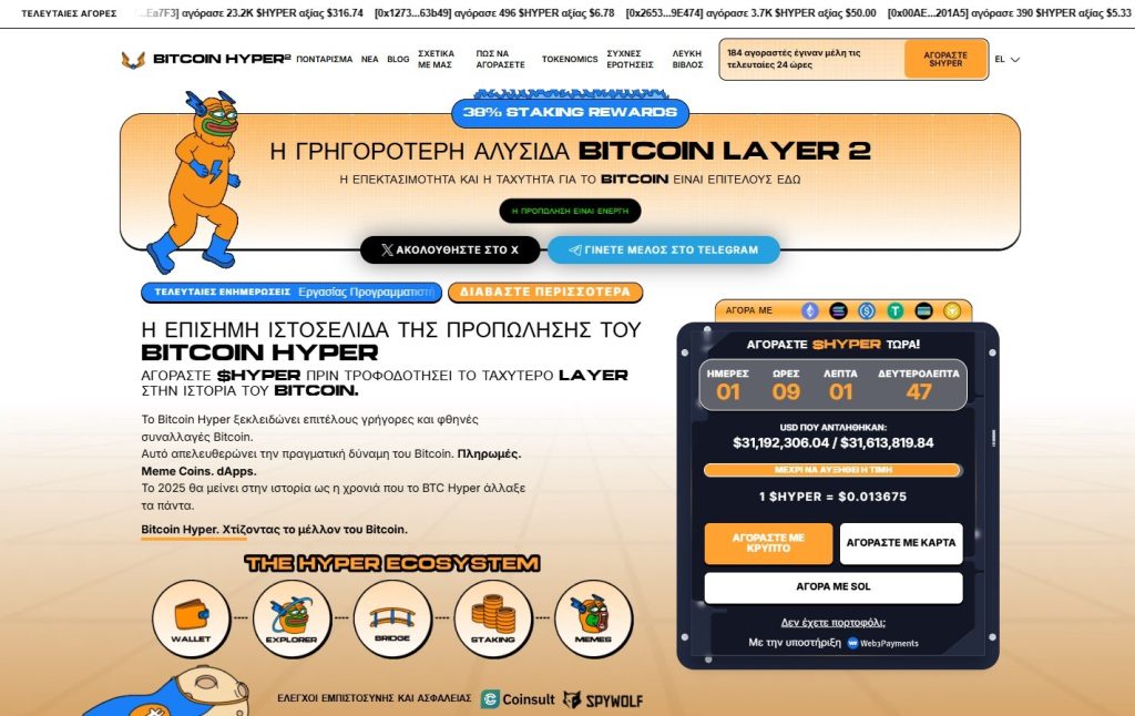 Μια από τις πιο ενδιαφέρουσες επενδυτικές επιλογές αυτή τη στιγμή είναι το Bitcoin Hyper. Πρόκειται για ένα Layer-2 project πάνω στο Bitcoin, σχεδιασμένο για μεγαλύτερη ταχύτητα και επεκτασιμότητα, προσφέροντας ασφάλεια και δυνατότητες απόδοσης που παραμένουν ανεπηρέαστες από τις βραχυπρόθεσμες διακυμάνσεις της αγοράς.
