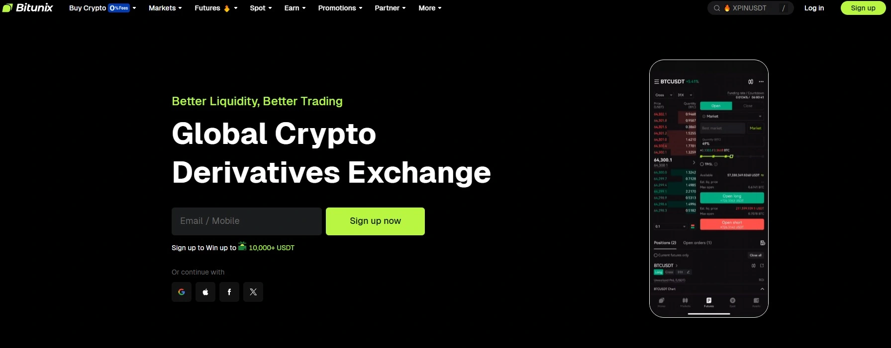 Látogass el a Bitunix hivatalos oldalára, majd kattints a Sign Up (Regisztráció) gombra. Fiókot e-mail-címmel vagy telefonszámmal hozhatsz létre, de akár a Google-, Apple-, Facebook- vagy X-fiókoddal is bejelentkezhetsz.