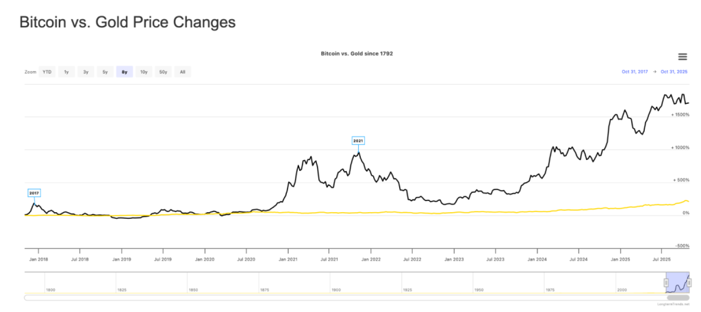 Bitcoin telah lama menyandang gelar sebagai ‘emas digital’ karena daya tahannya sebagai penyimpan nilai. Namun, realitas teknologinya jauh melampaui peran pasif seperti emas. Sejak pertama kali diluncurkan, Bitcoin telah mencatat pertumbuhan mengejutkan sebesar 174.410.533%, angka yang jelas tak tertandingi oleh komoditas konvensional mana pun.