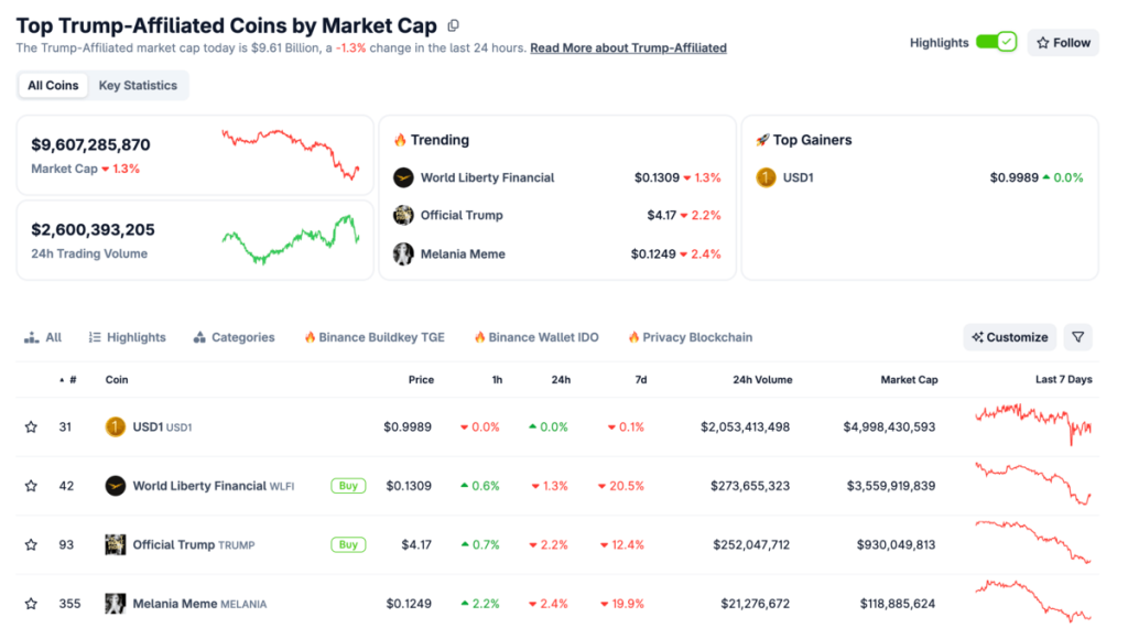 - Token WLFI: Token asli platform DeFi Trump, World Liberty Financial, turun 63% dari puncak September 2025. WLFI diperdagangkan di $0.130 dengan kapitalisasi pasar yang menyusut drastis.