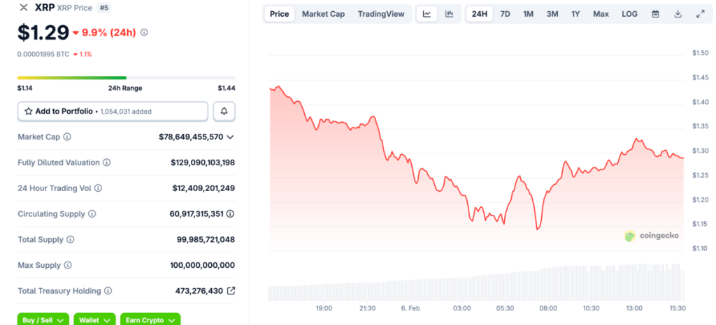 Dari high Januari 2026 di $2.41, XRP kini diperdagangkan 45% lebih rendah. Itu kerugian yang sangat dalam. Penurunan XRP ini juga bagian dari aksi jual luas di pasar. Bitcoin sendiri terkoreksi sekitar 10% mendekati $65.000, Ethereum jatuh di bawah $2.000, dan Solana berdagang di dekat $82. Semua mata uang kripto utama berwarna merah menyala, menciptakan suasana kepanikan yang sempurna.