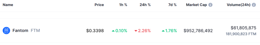 Attualmente, Fantom (FTM) è scambiata a 0,3417 dollari e vanta una capitalizzazione di mercato di circa 958 milioni di dollari.