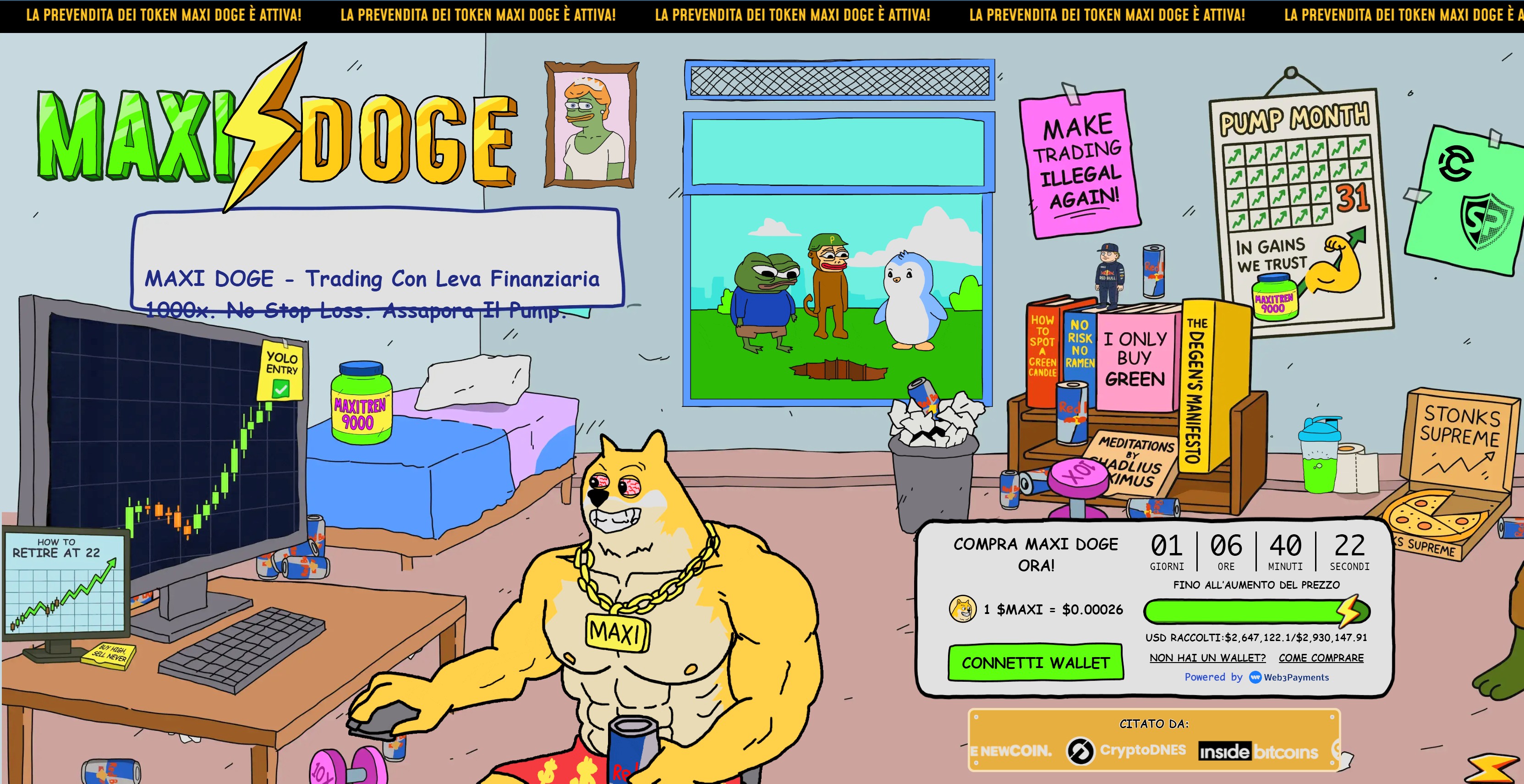 Maxi Doge (MAXI) è il tipo di progetto improbabile ma intrigante. Questa meme coin è in piena fase di prevendita e ha già raccolto più di 2,6 milioni di dollari. Il suo universo è totalmente consapevole: Red Bull, YOLO, leva finanziaria 1.000x e zero piano B. In altre parole, attira una comunità pronta a correre dei rischi.