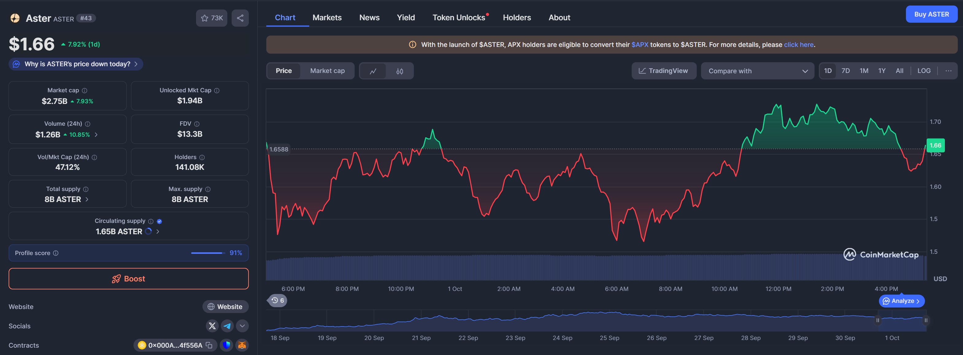 Il buzz è tale che Aster è già stato soprannominato “il DEX preferito di CZ”, poiché l’ex capo di Binance ha pubblicamente elogiato il progetto e ha annunciato di essere un “consulente” del team. Il risultato: credibilità immediata e un massiccio afflusso di capitali.
