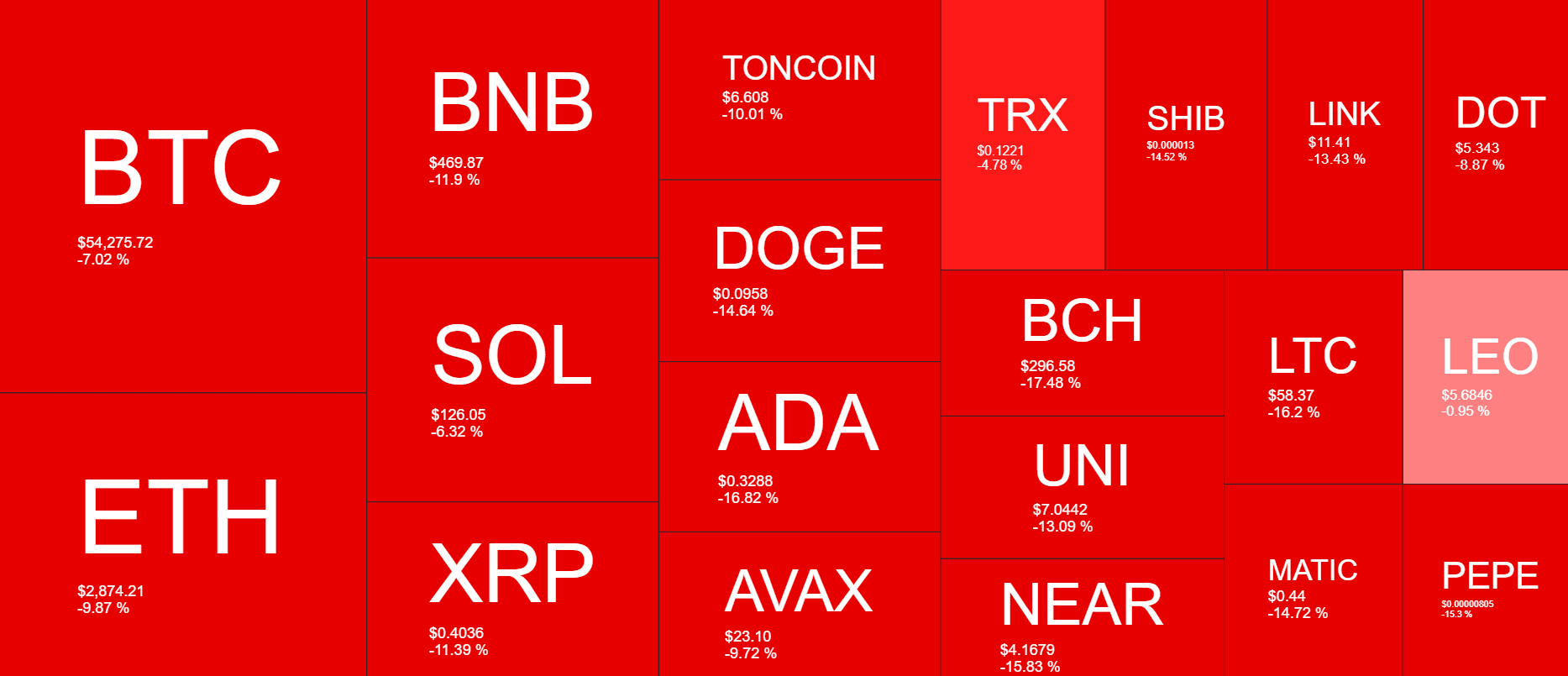 Anche il settore delle meme coin è pesantemente in rosso, con perdite di quasi il 20% della sua capitalizzazione di mercato totale. Alcuni dei peggiori performer sono: Dogecoin (DOGE), Shiba Inu (SHIB), Pepe (PEPE), Floki Inu (FLOKI) e Brett (BRETT).