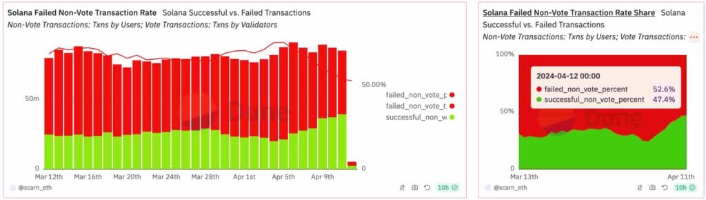 Nel momento in cui scriviamo, il 12 aprile, il tasso di fallimento delle transazioni è del 52,6%, secondo la dashboard di Dune Analytics realizzata da scarn_eth. Questo livello è stato mantenuto per oltre un mese e in precedenza ha raggiunto tassi superiori al 75%.