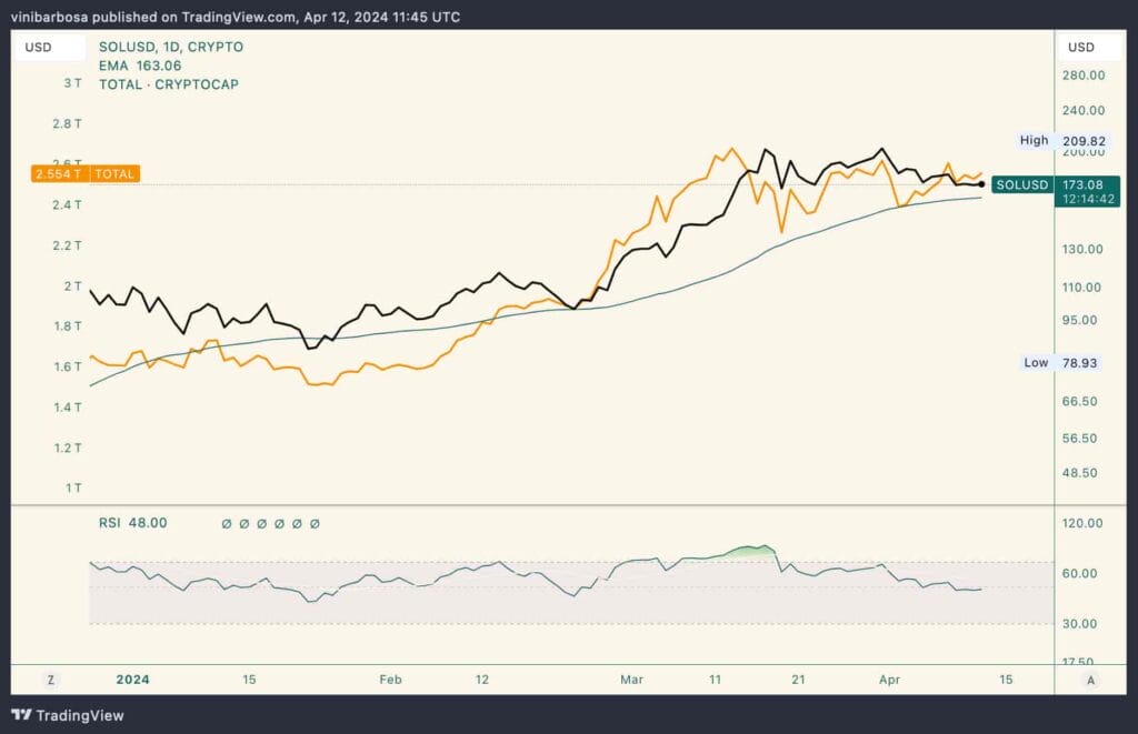 Al momento SOL rimane la quinta criptovaluta di maggior valore, scambiata a 173 dollari, correlata all’indice di capitalizzazione totale del mercato delle criptovalute di TradingView.