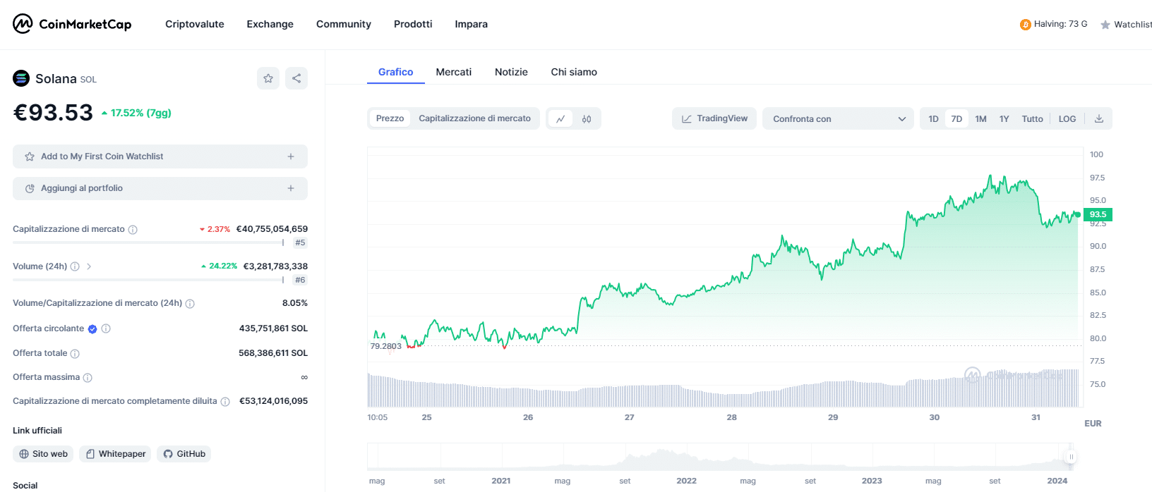 Grafico del valore di SOL relativo a sette giorni. Fonte: CoinMarketCap