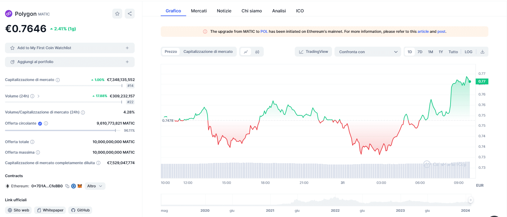 Al momento MATIC sta scambiando a 0.77 dollari, con una perdita di circa il 2,83% in 24 ore, mentre rimane in guadagno negli ultimi sette giorni e nel corso dell’ultimo mese.