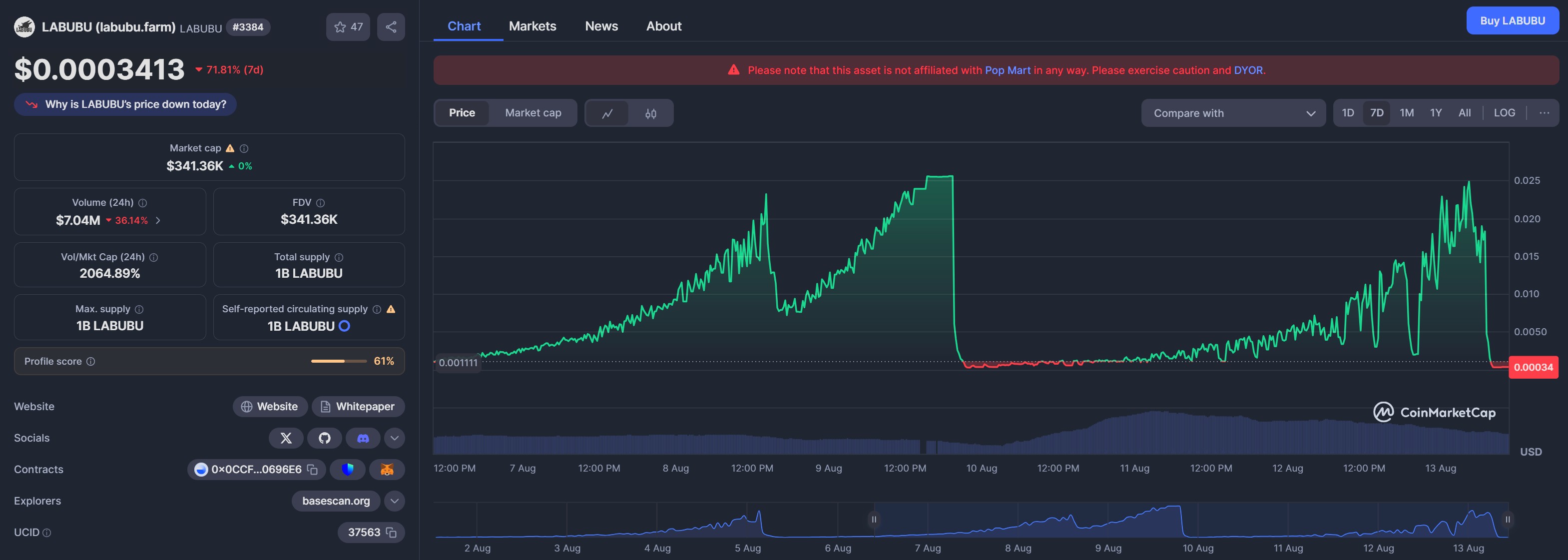 Al momento della stesura dell’articolo, il prezzo è calato del 96,36% nelle ultime 24 ore e del 71,81% negli ultimi sette giorni. Osservando con attenzione il grafico settimanale, però, si può notare che LABUBU segue un andamento di prezzo con un pattern ripetitivo, che alterna improvvisi cali con progressivi e sostanziali rialzi. Questo potrebbe quindi essere il momento giusto per prendere posizione a un prezzo scontato e prepararsi a un rendimento elevato non appena la meme coin raggiungerà il prossimo picco.