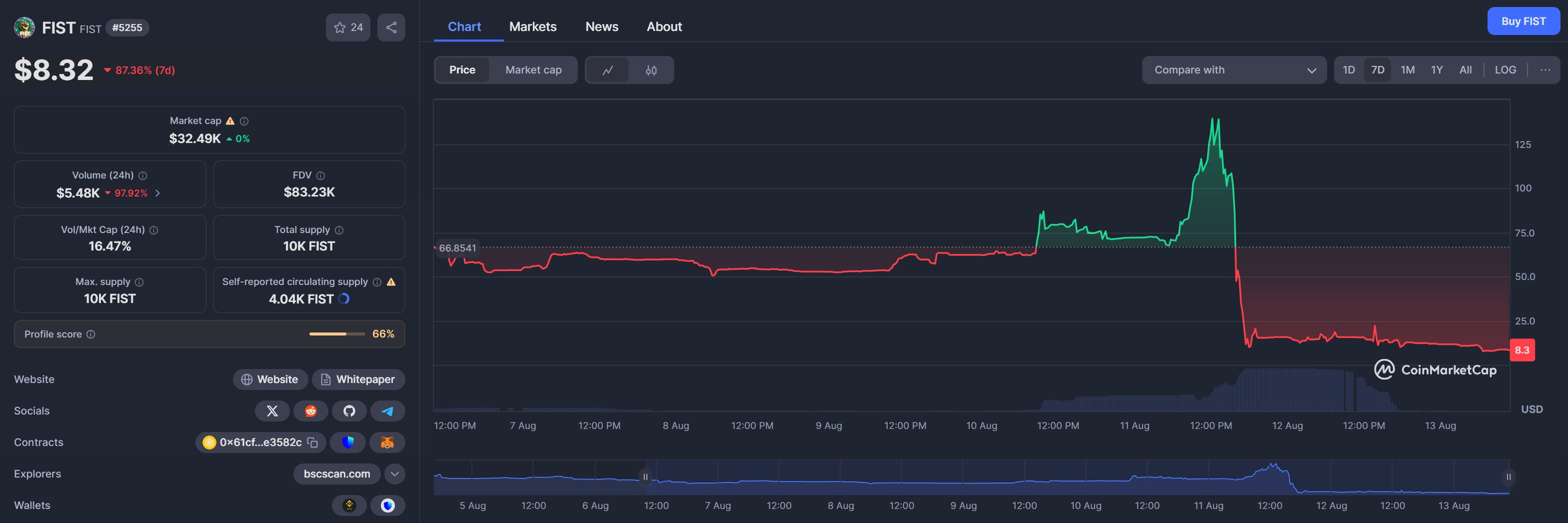 Al momento della pubblicazione dell’articolo, FIST è scambiato a 8,32 dollari con un volume giornaliero di circa 5.480 dollari e un’offerta circolante minuscola di soli 4.040 token, giocando chiaramente nella categoria degli asset rari e speculativi. Un campo perfetto per investitori esperti… ma anche un mercato in cui la cautela è indispensabile.