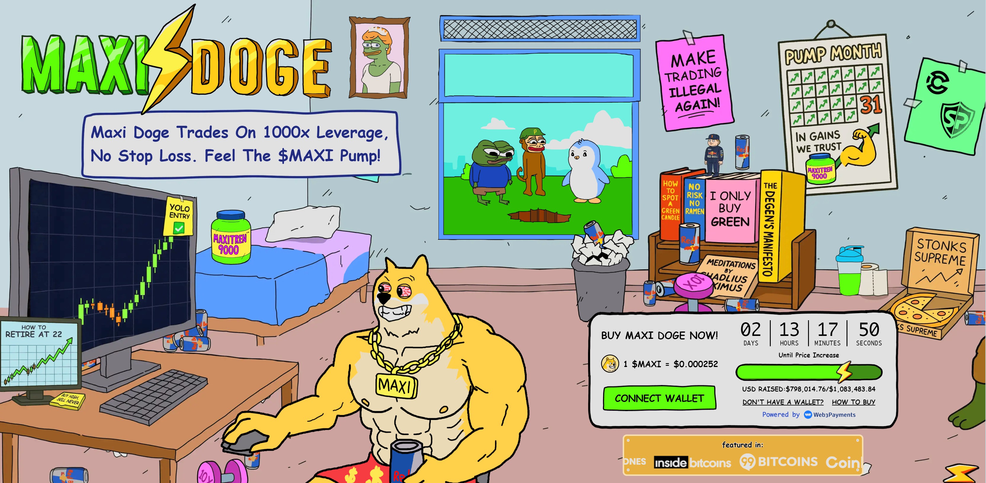 Maxi Doge (MAXI) è la meme coin dei trader che non hanno paura del rischio. Qui non si parla di piccoli leverage timidi: si parla di 1000x, senza stop loss e con un unico obiettivo… il pump. La mascotte? Un cane muscoloso che stringe un grafico verde come una spada laser, sempre pronto a lanciarsi sulla prossima opportunità.