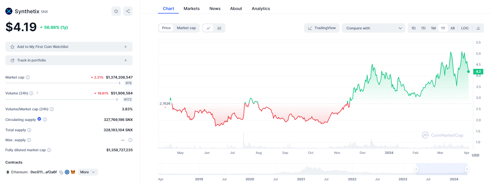 Il token SNX ha avuto un aumento contenuto nell’ultimo anno, anche se ha iniziato a salire a ottobre del 2023. Offre quindi discrete opportunità di crescita ma va approcciato con cautela.