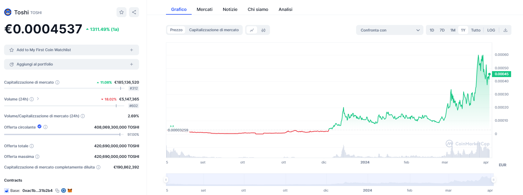 Tra le meme coin abbiamo invece optato per Toshi, costruita sulla blockchain di Base. Il suo creatore, pur rimanendo anonimo, è conosciuto in ambito crypto ed ha sviluppato diversi progetti su Base.