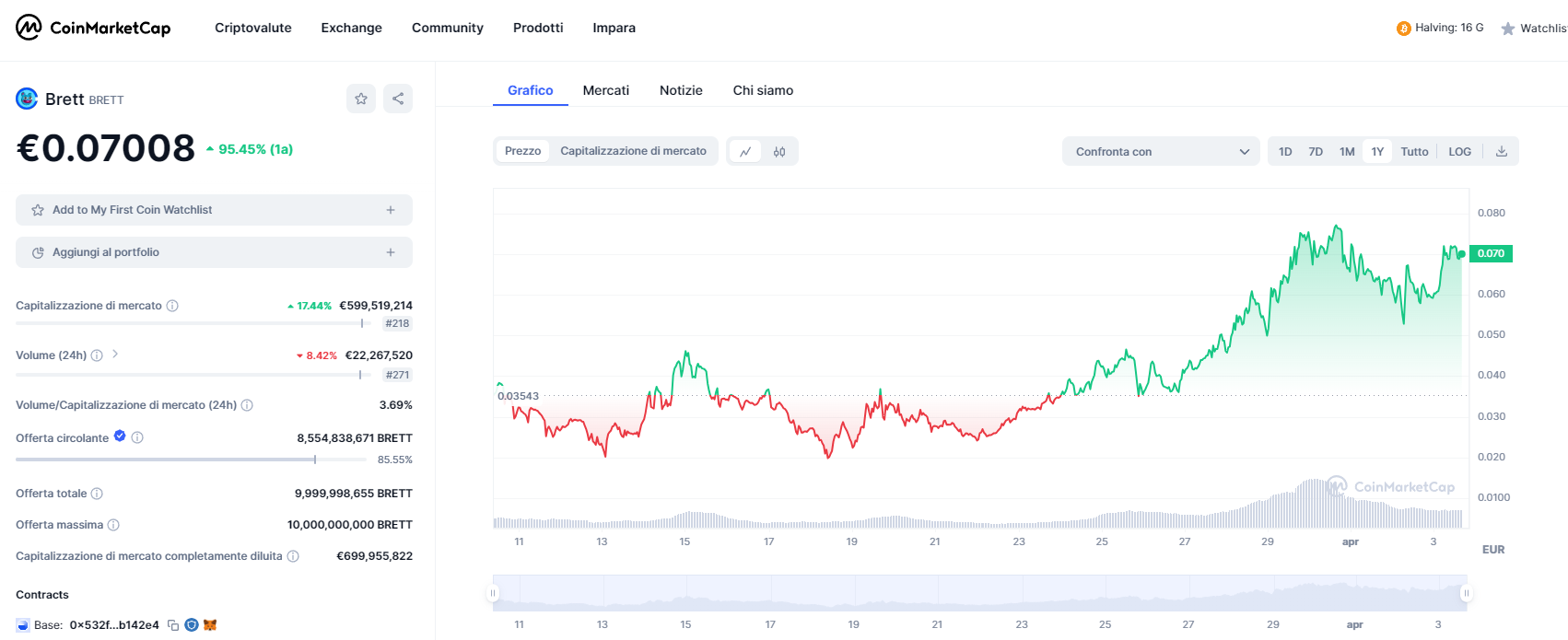 Un’altra alternativa interessante, se volete esporvi alle meme coin, è sicuramente Brett. Anche se è salito del 100% ci sono ancora ottime probabilità di crescita.
