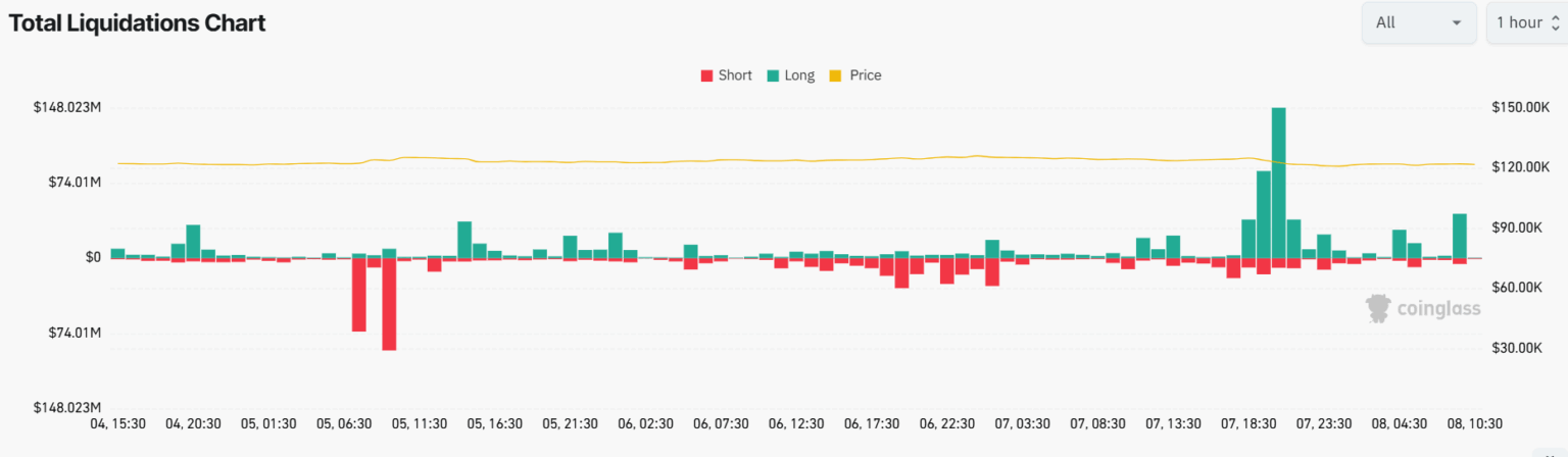 A causa delle massicce prese di profitto, Bitcoin (BTC) ha perso forza ed è crollato di oltre il 4% a 121.257 dollari dal massimo storico di 126.200 dollari. Ethereum (ETH) registra un calo del 7% a 4.436 dollari, con liquidazioni estremamente più elevate rispetto a Bitcoin nelle ultime 24 ore. Questo è un segno distintivo delle fasi di euforia, in cui la redditività diffusa spesso alimenta un’accelerazione delle prese di profitto e un aumento del rischio di crolli di mercato.