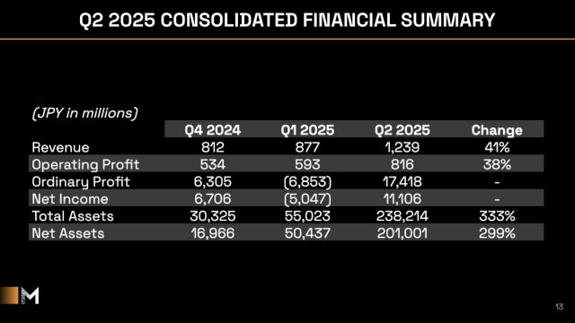 I ricavi sono aumentati del 41% trimestre su trimestre, raggiungendo 1,239 miliardi di yen, mentre l’utile lordo è cresciuto del 38% a 816 milioni di yen. Il totale degli asset è balzato del 333% a 238,2 miliardi di yen (1,61 miliardi di dollari), mentre il totale del patrimonio netto è salito del 299% a 201,0 miliardi di yen (1,36 miliardi di dollari), con un conseguente equity ratio dell’84,2%.