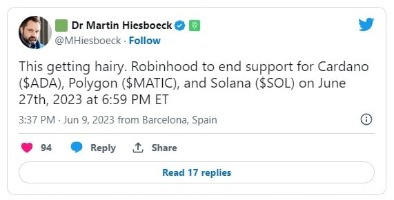 Come accennato in precedenza, ADA sta attualmente affrontando difficoltà soprattutto a causa dell’azione legale intrapresa dalla SEC contro Coinbase e Binance, che ha indicato l’altcoin come un titolo. Questo evento non solo ha portato a una brusca caduta del valore di ADA, ma ha anche portato alla sua rimozione dalla lista di criptovalute offerte da Robinhood.