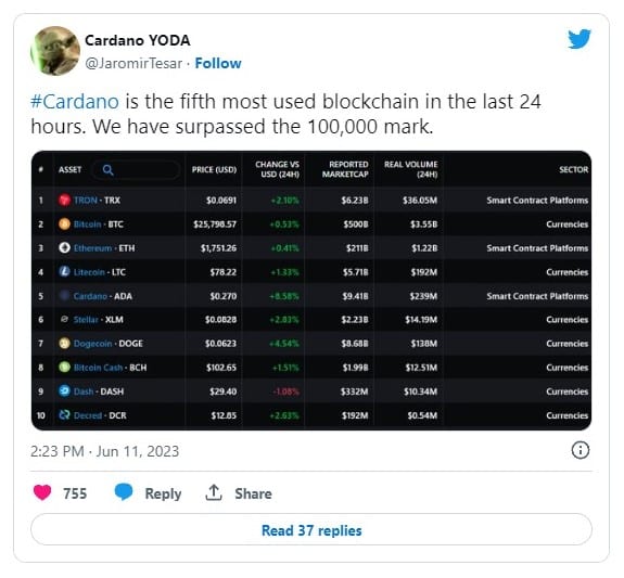 È importante evidenziare che i fondamentali di Cardano, come piattaforma blockchain, sono solidi e in una posizione favorevole. Cardano continua a crescere costantemente, diventando di recente la quinta blockchain più utilizzata nel settore.