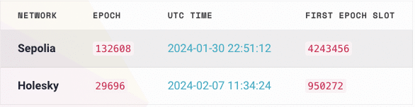 Scendendo nei dettagli, il team ha dichiarato che la testnet Sepolia si attiverà alle 22:51:12 UTC in concomitanza con l’epoca 132608. Il lancio di Holesky è invece previsto per le 11:34:24 – epoca 29696 – con il primo slot d’epoca in linea a 950272.
