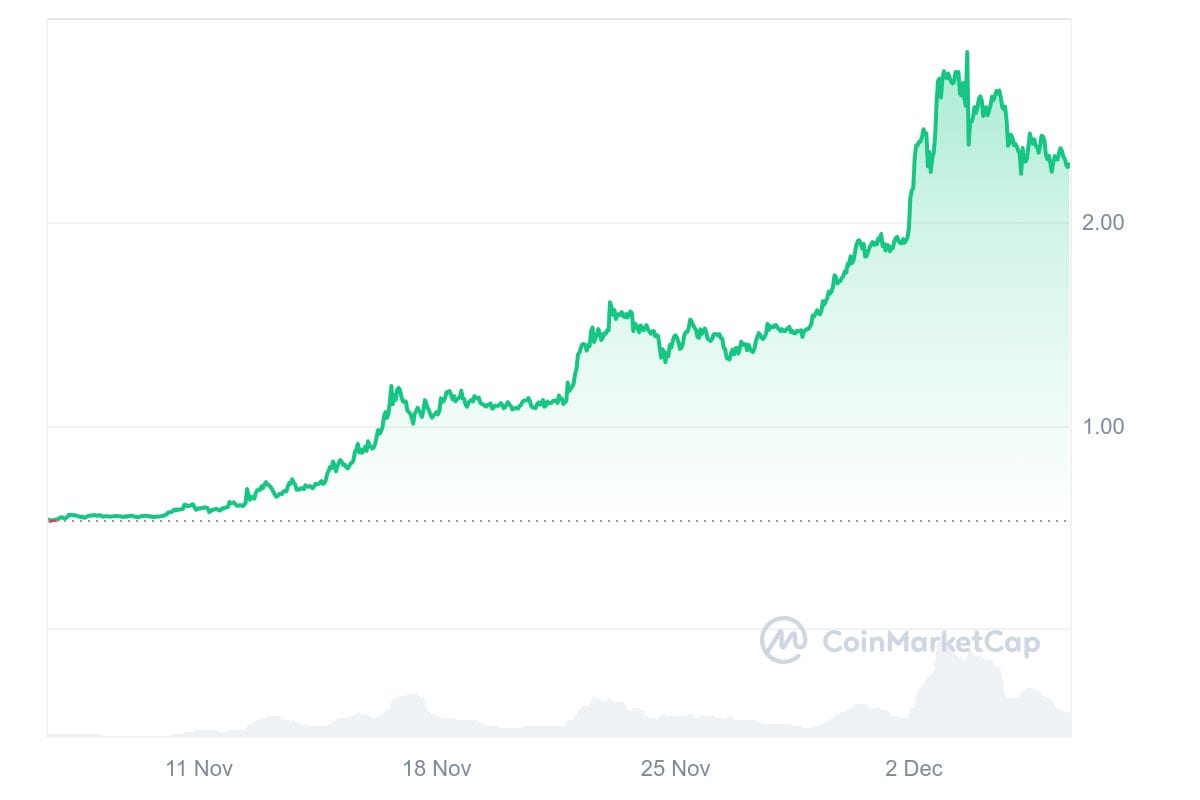 Il token di Ripple ha registrato una performance notevole nei mesi di novembre e inizio dicembre, con l’asset che ha sfondato la soglia dei 2 dollari. Il 3 dicembre, XRP ha raggiunto un picco a 2,90 dollari, anche se resta ancora lontano dal massimo storico di 3,40 dollari.
