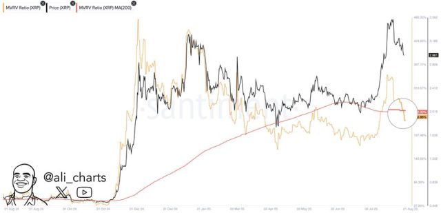 XRP potrebbe registrare un rialzo oggi grazie alle crescenti aspettative di tagli ai tassi previsti per settembre, anche se permangono alcune criticità. L’analista Ali Martinez evidenzia che il rapporto Market Value to Realized Value (MVRV) ha formato una “death cross”, un segnale che si verifica quando la media mobile semplice (SMA) a 50 giorni attraversa verso il basso quella a 200 giorni.