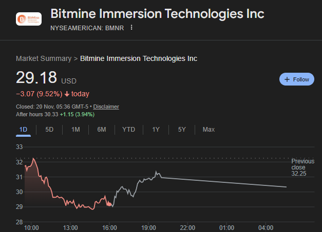 BitMine, che sta aggiungendo Ethereum al proprio bilancio, ha chiuso in calo del 9,5% a 29,18 dollari, per poi recuperare il 6% nelle contrattazioni di fine giornata.
