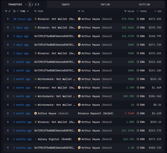 I dati di Arkham Intelligence mostrano che Hayes ha effettuato acquisti di ENA con regolarità negli ultimi mesi su Binance, Wintermute e Galaxy Digital.