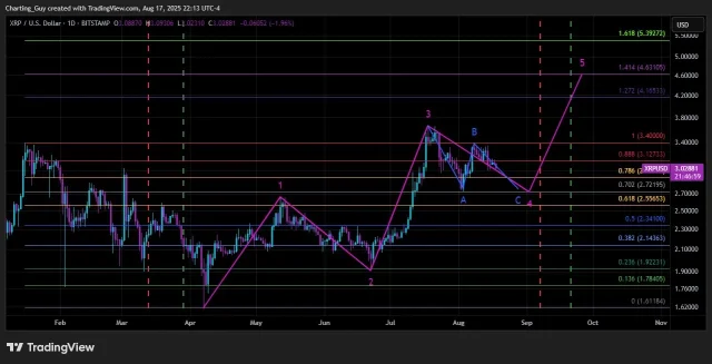 Il grafico giornaliero di XRP si è trasformato in un chiaro caso di studio delle Onde di Elliott. Questa è l’opinione di diversi analisti, tra cui il tecnico crypto Charting Guy, che sostiene che l’ultimo rimbalzo sia stato correttivo piuttosto che impulsivo e che probabilmente preceda un ritracciamento più profondo dell’onda C verso i minimi di agosto.