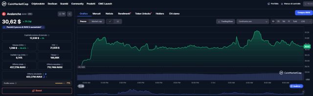 Anche se oggi guadagna solo il 2% secondo i dati di CoinMarketCap, Avalanche sembra essere tornato sulla cresta dell’onda, come testimonia il +28% sul dato mensile.