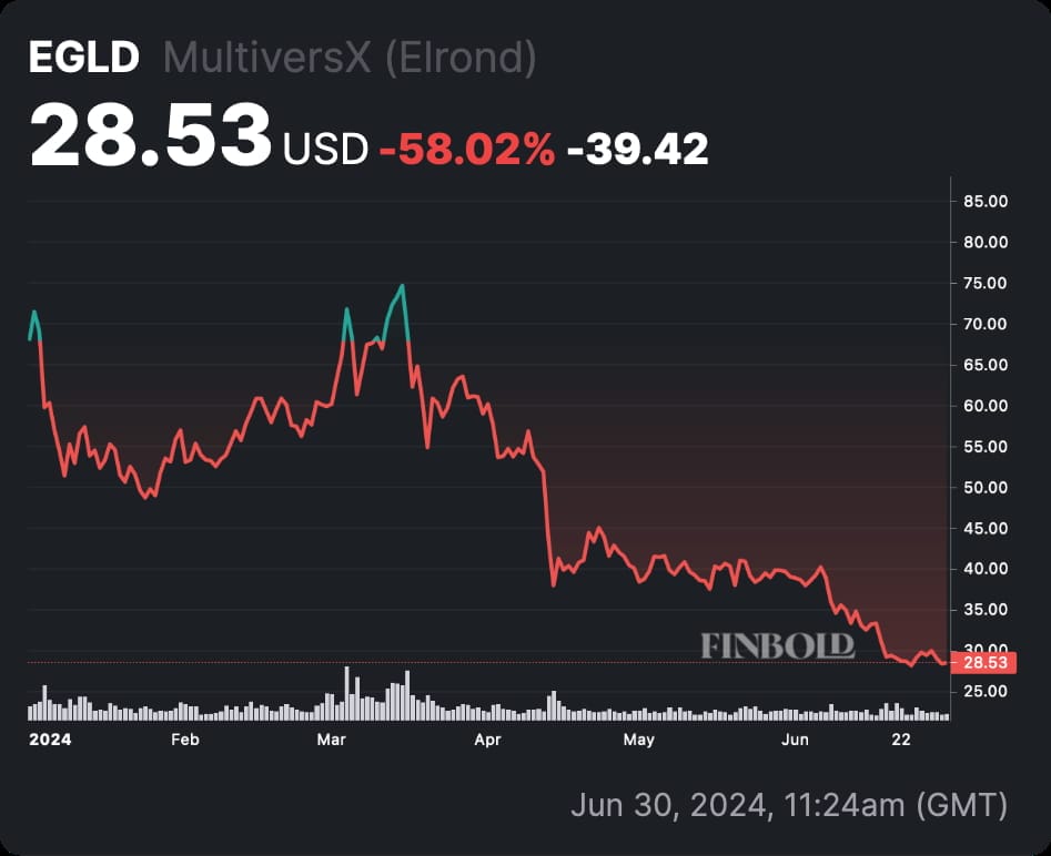 Al momento il token eGold (EGLD) sta scambiando a 28,53 dollari. Ha subito un forte calo del 58% in un anno, segno che si tratta di una crypto ipervenduta. Il suo market cap si attesta a 775 milioni di dollari, 83 volte inferiore alla capitalizzazione di 65 miliardi di dollari di Solana.