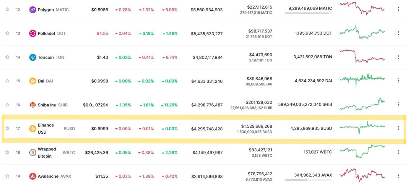 Questa diminuzione colloca BUSD al di sotto della stablecoin decentralizzata DAI, che ha visto un notevole aumento della sua capitalizzazione di mercato negli ultimi due giorni, superando i 4,6 miliardi di dollari.