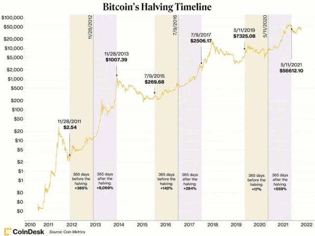 Il grafico di CoinDesk dimostra il trend con cui Bitcoin reagisce a ogni evento di halving. Finora la crescita dei prezzi si è protratta per almeno un anno dopo l’halving. Poiché l’halving del 2024 è avvenuto ad aprile, si attendono ulteriori aumenti per Bitcoin nei prossimi mesi comprendendo buona parte del 2025.