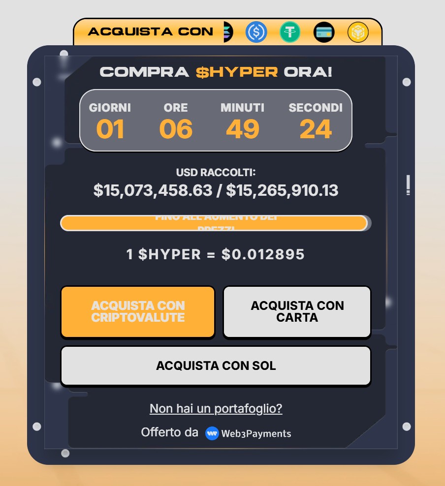 L’entusiasmo intorno a Bitcoin Hyper non riguarda solo la tecnologia. La prevendita è diventata uno dei più grandi eventi virali dell’anno, raccogliendo finora più di 15 milioni di dollari, ed è possibile acquistare i token HYPER al prezzo unitario di 0,012895 dollari.