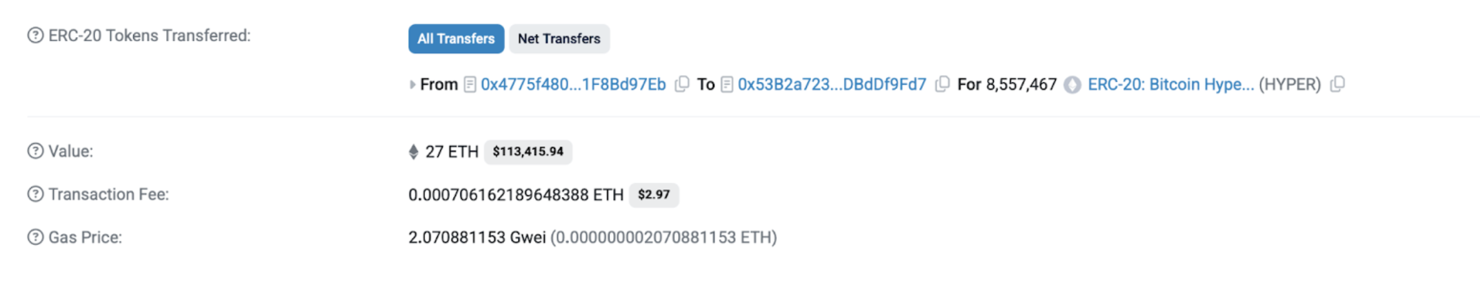 In totale, le tre transazioni hanno raggiunto i 24,6 milioni di token HYPER per un valore di 327.000 dollari.
