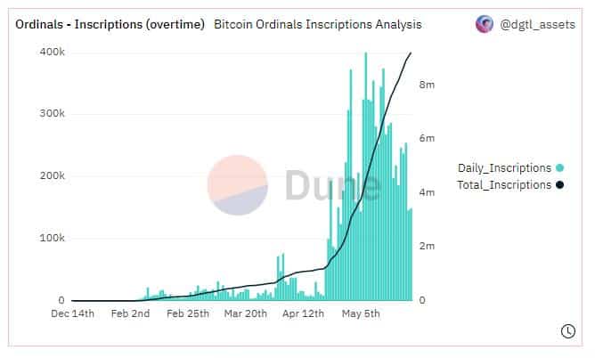 Secondo Dune, il numero totale di sottoscrizioni di Ordinals ha superato i 9 milioni al momento. Solo a maggio ne sono stati emessi ben 6,5 milioni, ovvero circa il 70%.