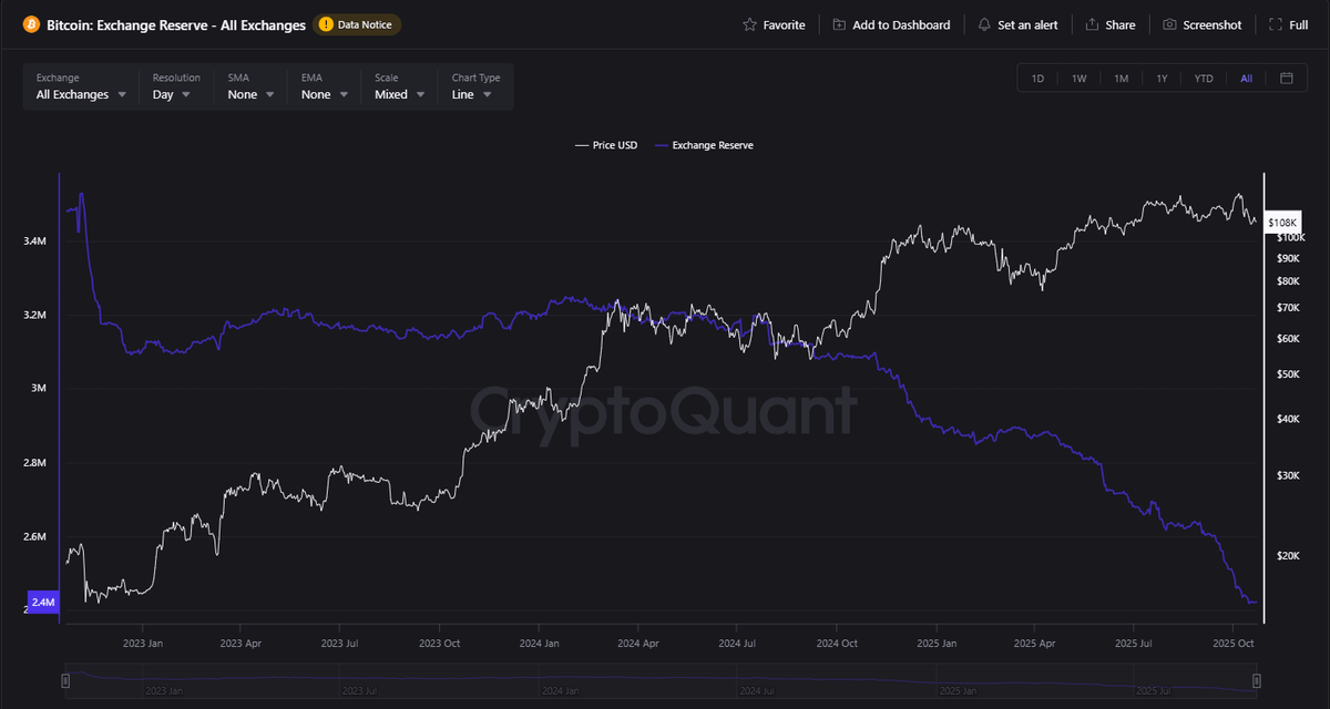 Anche i dati on-chain confermano lo stesso scenario: le istituzioni continuano ad accumulare, le riserve di Bitcoin sugli exchange sono ai minimi pluriennali e la pressione di vendita dei miner si è ridotta dopo l’halving.