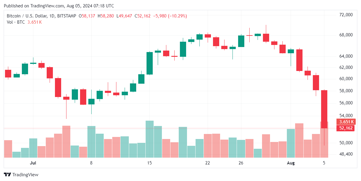 Tuttavia, la fine del mese e il passaggio ad agosto hanno visto un ulteriore calo delle criptovalute. Il calo continua ancora adesso: $BTC è in calo del 12,6% mentre cerca disperatamente di recuperare terreno. Dopo essere brevemente sceso intorno a $49.000, nelle ultime ore il prezzo è tornato a crescere e adesso è scambiato al di sopra della soglia di $52.000.
