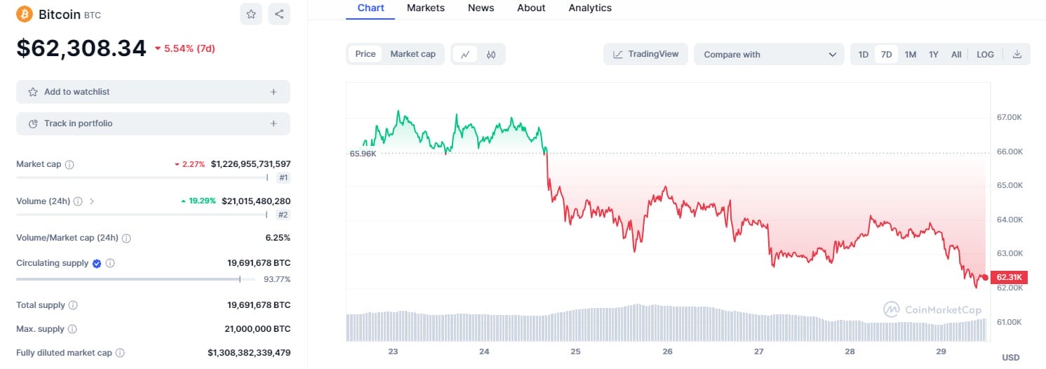 Secondo i dati di CoinMarketCap, attualizzati al momento della stesura di questo articolo, Bitcoin era scambiato a 62.308 dollari, con un calo di circa il 2,29% nelle ultime 24 ore e del 5,54% negli ultimi sette giorni.