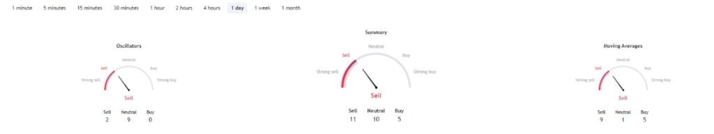 Altrove, una revisione dell’analisi tecnica a un giorno di Bitcoin, fornita da TradingView, fa eco a sentimenti ribassisti. Un riepilogo degli indicatori indica un sentimento di “vendita” a 11, mentre le medie mobili segnalano anch’esse “vendita” a 9. Lo stesso sentimento ribassista è rispecchiato dagli oscillatori, con una lettura dell’indicatore pari a 2.