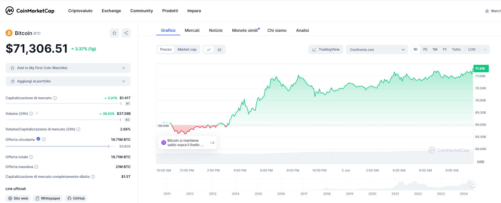 Ottime notizie per i possessori di criptovalute che oggi sono in rialzo grazie anche alle performance di Bitcoin salito a quota 71.000 dollari. Il grafico giornaliero di CoinMarketCap mostra lo slancio di BTC che ha guadagnato quasi il 5% in una settimana e il 12% in un mese.