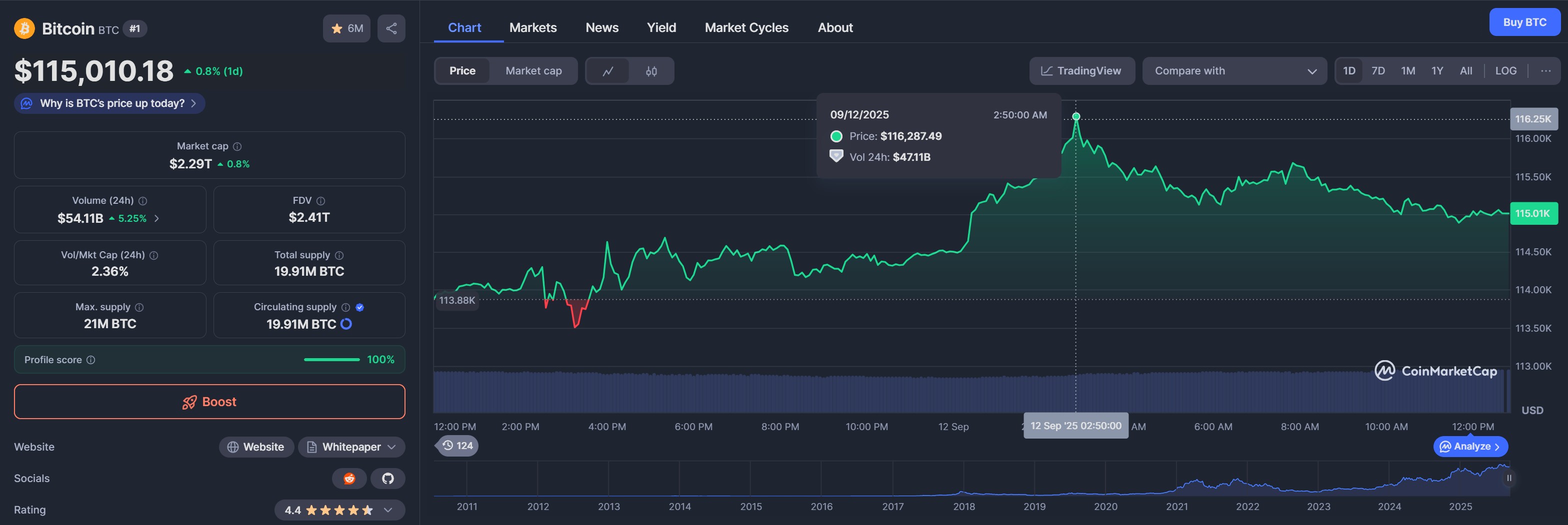 Nel frattempo, Bitcoin ha registrato una certa ripresa di recente. Oggi la principale criptovaluta ha toccato un picco di 116.287 dollari, ma al momento della pubblicazione dell’articolo era scambiata a 115.010 dollari.