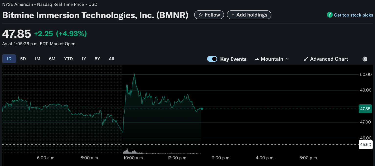 Dopo l’acquisto di oggi, il titolo BMNR di BitMine è scambiato a 47,85 dollari, con un aumento del 4,93% nella giornata. Da inizio anno (YTD), il titolo ha registrato un aumento del 559%, diventando uno dei titoli legati alle criptovalute con le migliori performance dell’anno.