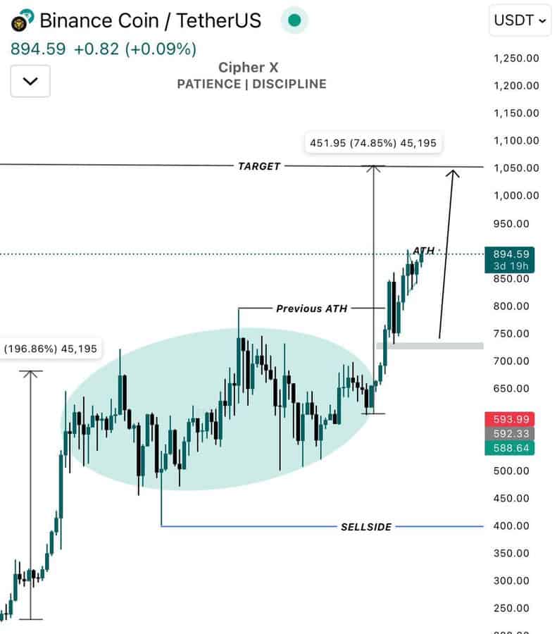 Secondo Cipher X, mantenere un prezzo superiore agli 880 dollari conferma il percorso verso i 1.000-1.050 dollari, mentre rialzi più forti potrebbero portare BNB a nuovi intervalli oltre tale soglia.