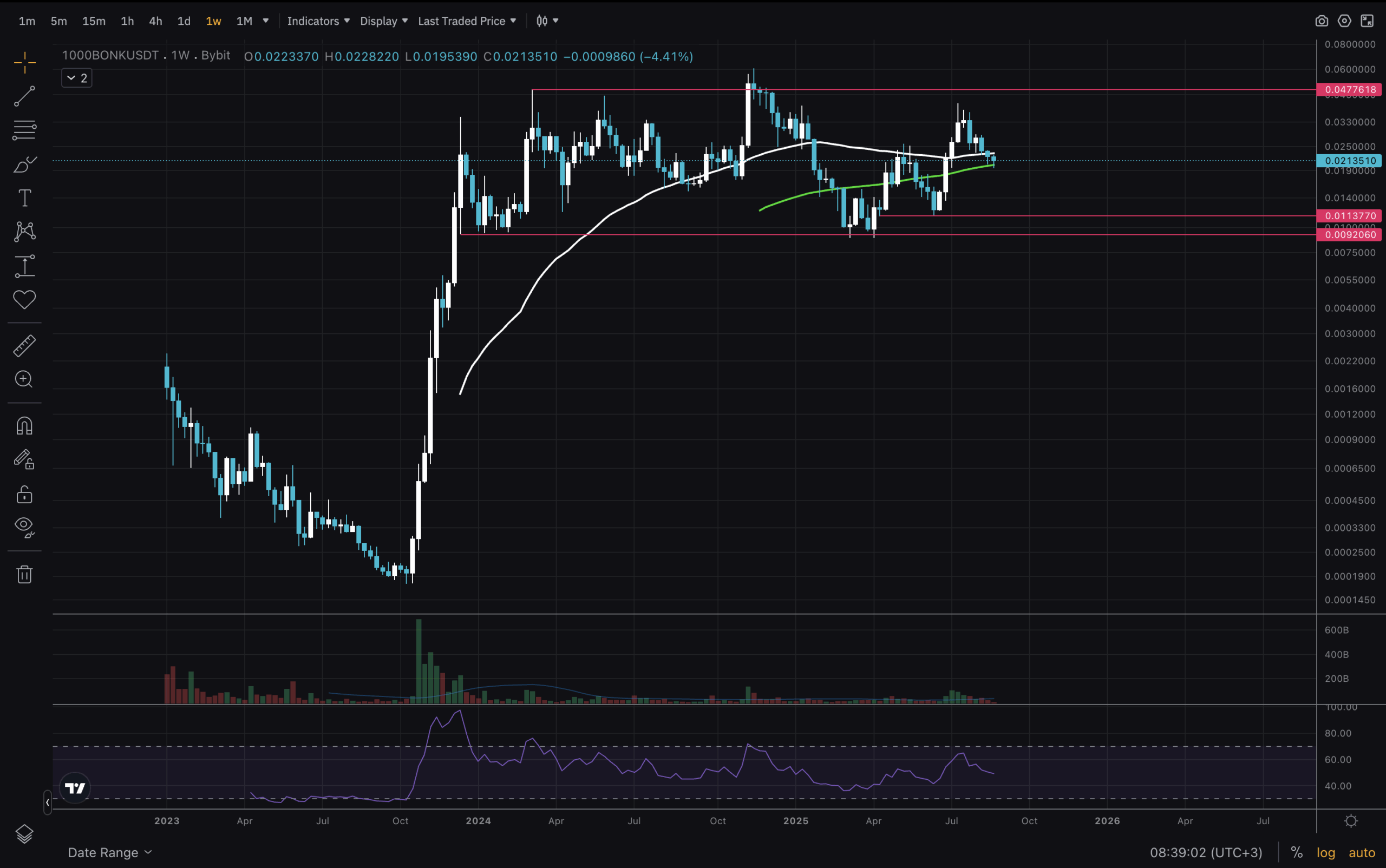 Il primo grafico che abbiamo esaminato è quello relativo al periodo di tempo di 1 settimana. In questo lasso di tempo il prezzo di BONK è rimasto compreso nella fascia tra 0,0092 dollari e 0,048 dollari, in cui si trova fin dal pumping del 2023. A prima vista potrebbe sembrare un intervallo troppo ampio, ma è bene ricordare che stiamo esaminando il grafico di una meme coin.