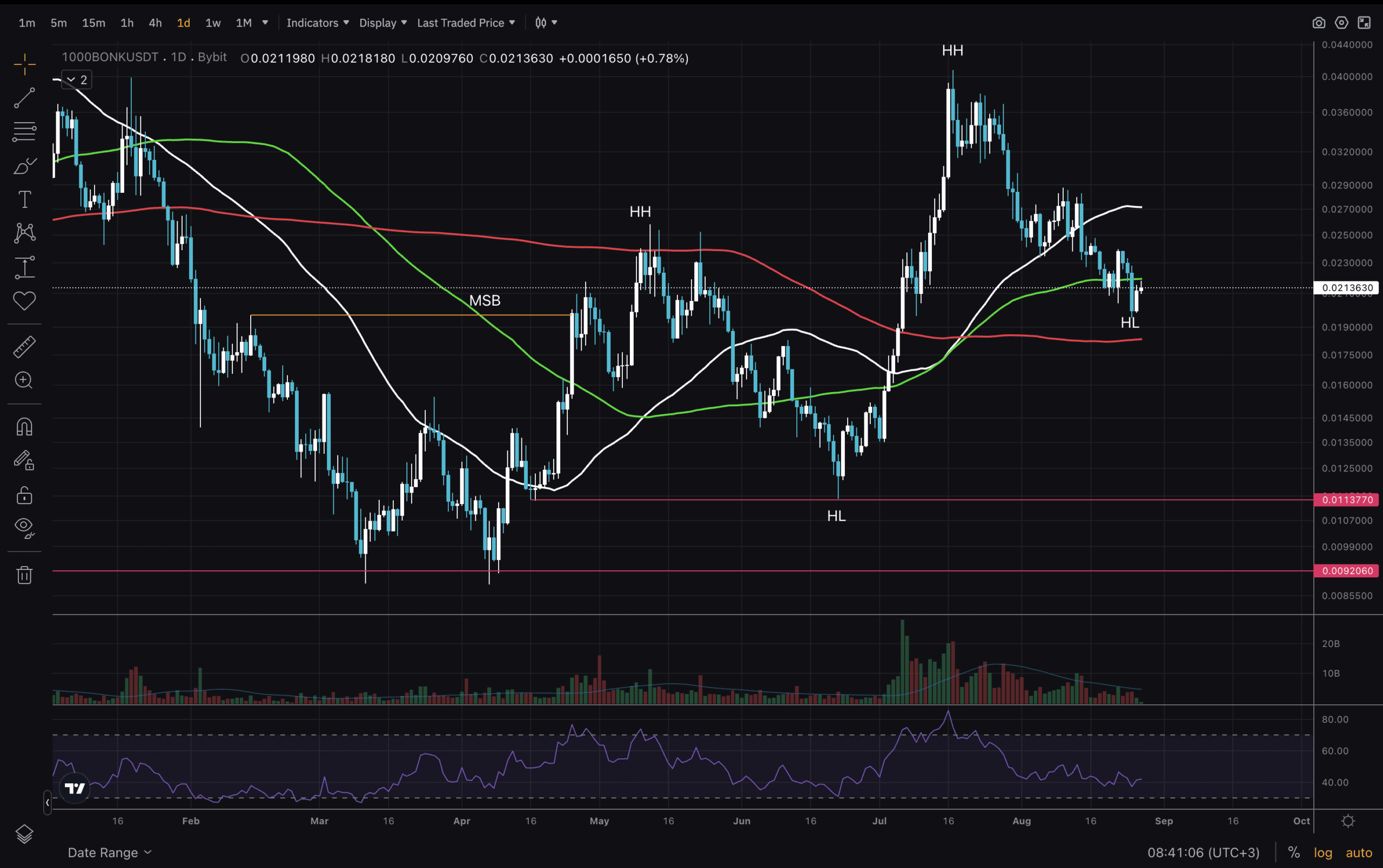 Ingrandendo il grafico, sul timeframe a 1 giorno, la nuova struttura di mercato di BONK diventa abbastanza visibile, con la possibilità che si formi il secondo Higher Low su base giornaliera.