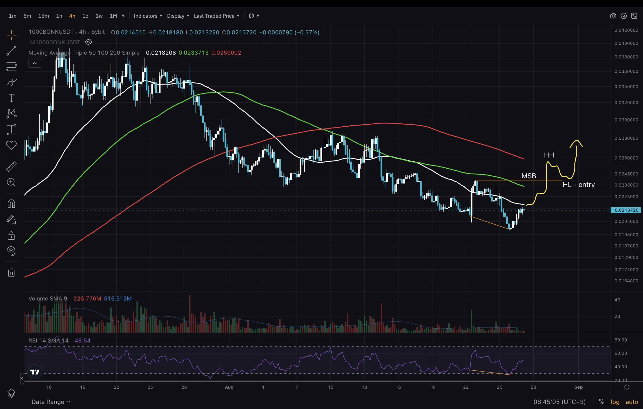 L’ultimo grafico di oggi è sul timeframe a 4 ore. Qui, il prezzo di BONK è al di sotto di tutte le medie mobili e sta ritestando il lato inferiore della media mobile a 50 giorni (MA50). Questo è il timeframe da tenere d’occhio se si sta cercando un ingresso.